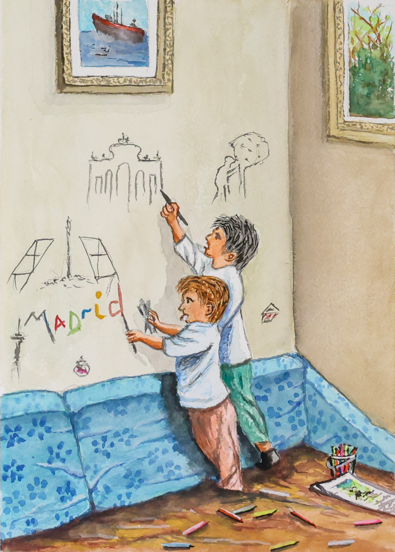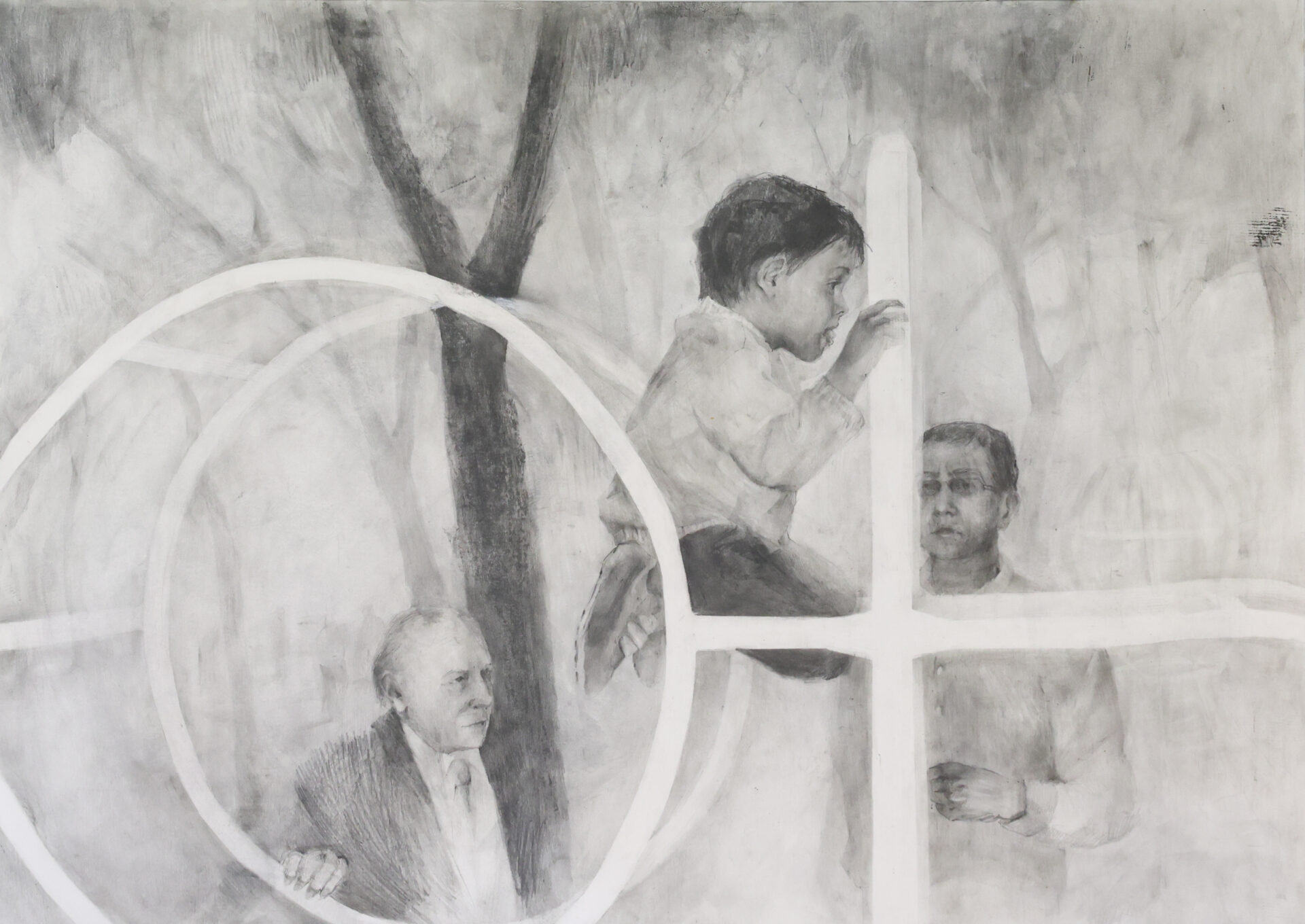 “En primer plano está el niño, de espaldas, en medio de un juego. Frente a él, cinco mujeres sentadas en un banco, cada una en su mundo, pero todas conectadas por la conversación. Miran y se escuchan. El fondo es sencillo, casi vacío, para que todo pase entre ellos, en una escena sobre generaciones”